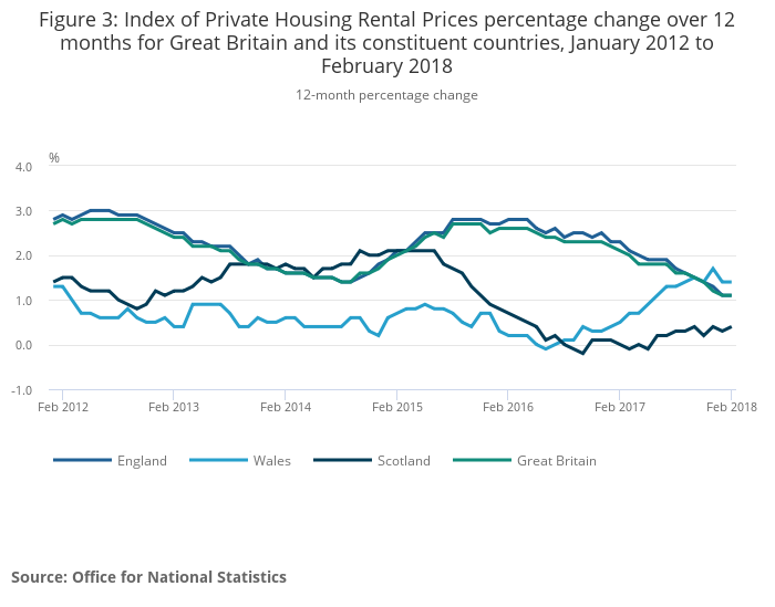 In England, private rental prices grew by 1.1%, Wales saw growth of 1.4% while Scotland saw rental prices increase by 0.4% in the 12 months to February 2018.