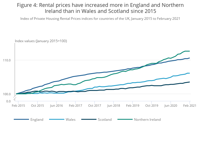 Image .csv .xlsAll UK countries experienced a rise in their private rental prices between January 2015 and February 2021, with rental prices in England and Northern Ireland increasing more than those in Wales and Scotland across data time series (Figure 4).