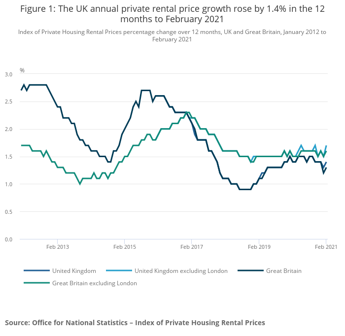 Figure 1: The UK annual private rental price growth rose by 1.4% in the 12 months to February 2021