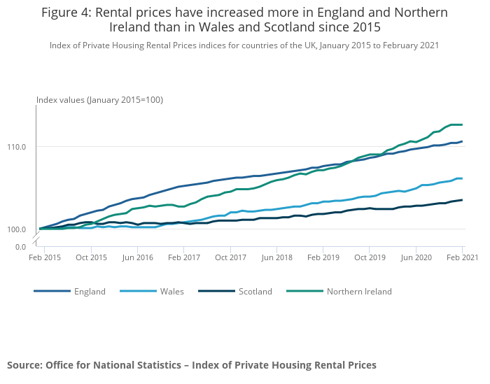 Private rental prices grew by 1.3% in England, 1.5% in Wales and 1.1% in Scotland in the 12 months to February 2021.