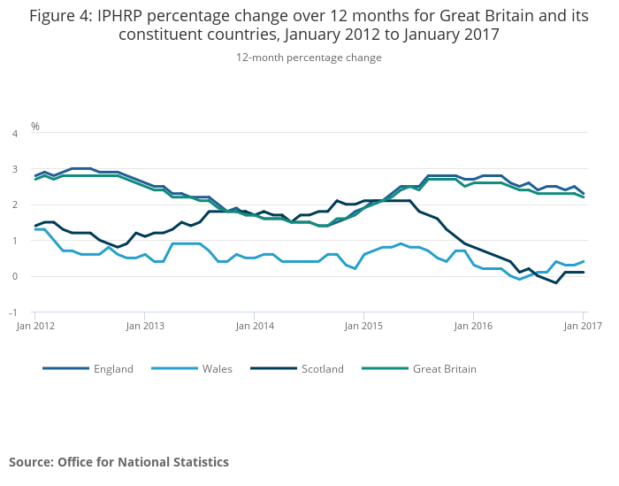 Download this chart Figure 4: IPHRP percentage change over 12 months for Great Britain and its constituent countries, January 2012 to January 2017
