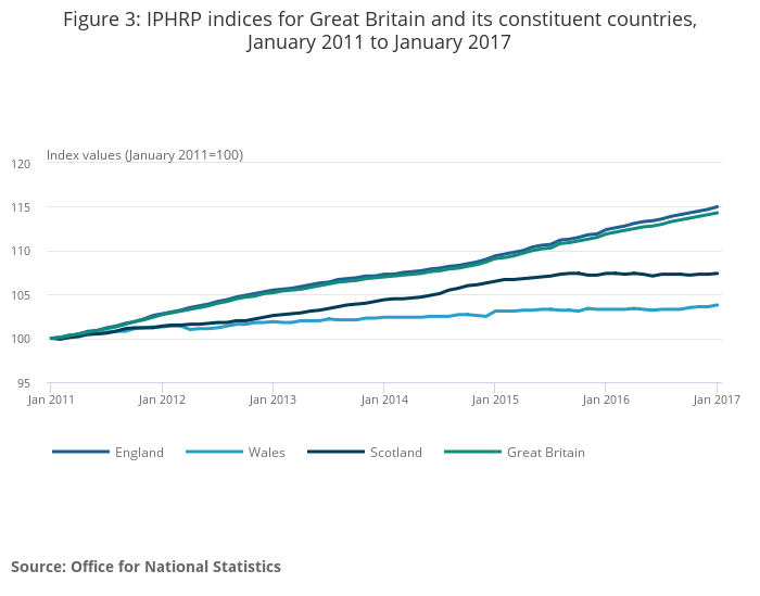 Download this chart Figure 3: IPHRP indices for Great Britain and its constituent countries, January 2011 to January 2017