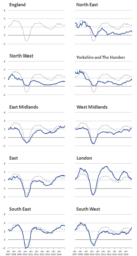 Download this chart Figure 5: IPHRP percentage change over the 12 months to January 2017 by English region