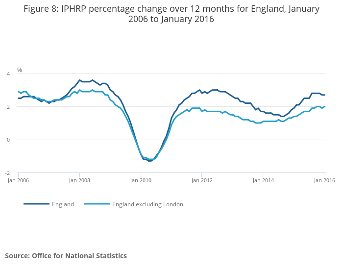 Download this chart Figure 8: IPHRP percentage change over 12 months for England, January 2006 to January 2016