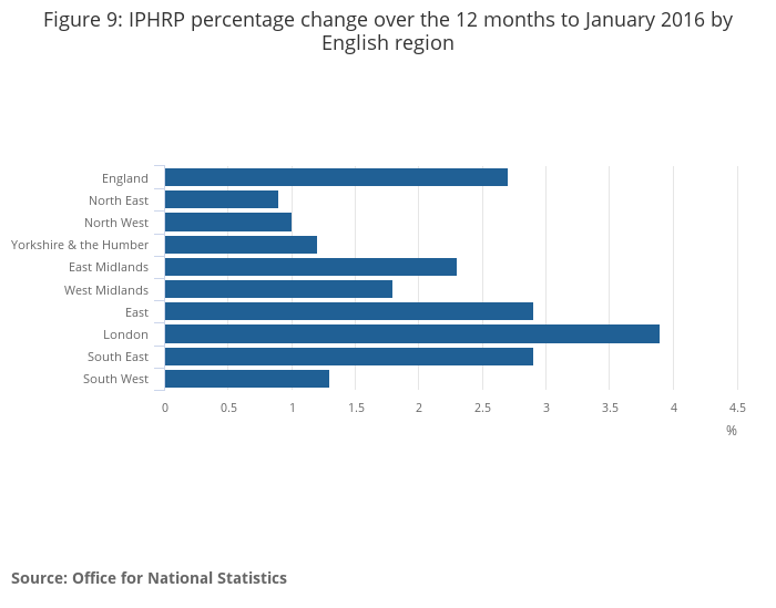 Download this chart Figure 9: IPHRP percentage change over the 12 months to January 2016 by English region