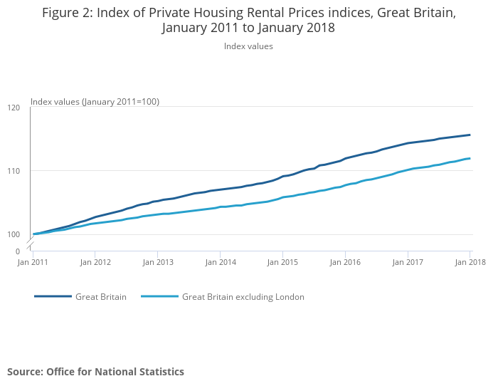 Between January 2011 and January 2018, private rental prices in Great Britain increased by 15.6% (Figure 2); this was strongly driven by the historical growth in private rental prices within London. When London is excluded from these figures, private rental prices increased by 11.9% over the same period.