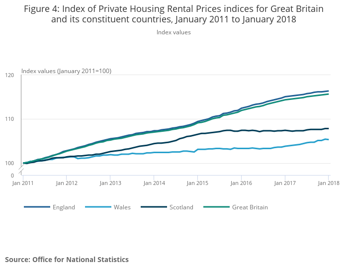 - In England, private rental prices grew by 1.1%, Wales saw growth of 1.4% while Scotland saw rental prices increase by 0.3% in the 12 months to January 2018.