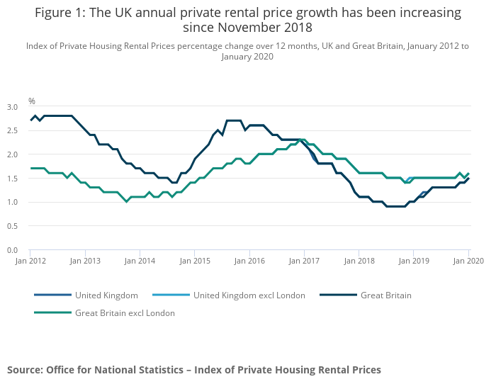 In the 12 months to January 2020, rental prices for the UK excluding London increased by 1.6%, up from 1.5% in December 2019 (Figure 1). London private rental prices increased by 1.3% in the 12 months to January 2020.