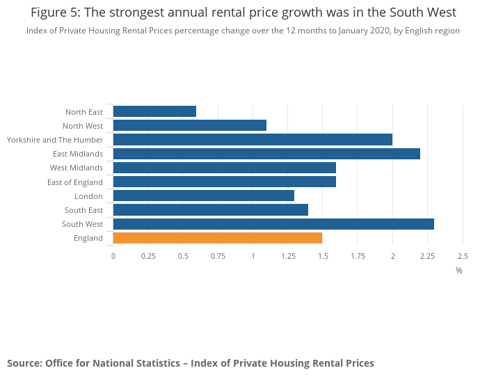 The lowest annual rental price growth was in the North East, where prices increased by 0.6% in the 12 months to January 2020, followed by the North West, which increased by 1.1%.