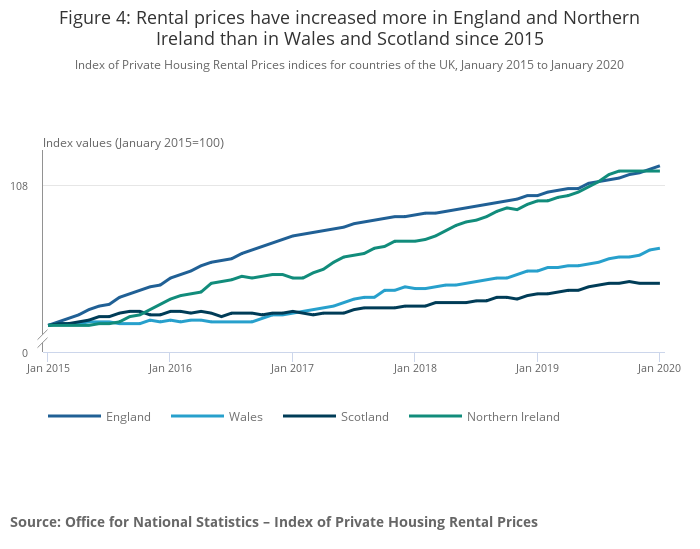 Image .csv .xlsAll UK countries have experienced a rise in their private rental prices between January 2015 (Figure 4) and January 2020. Since January 2015, rental prices in England and Northern Ireland have increased more than those in Wales and Scotland.