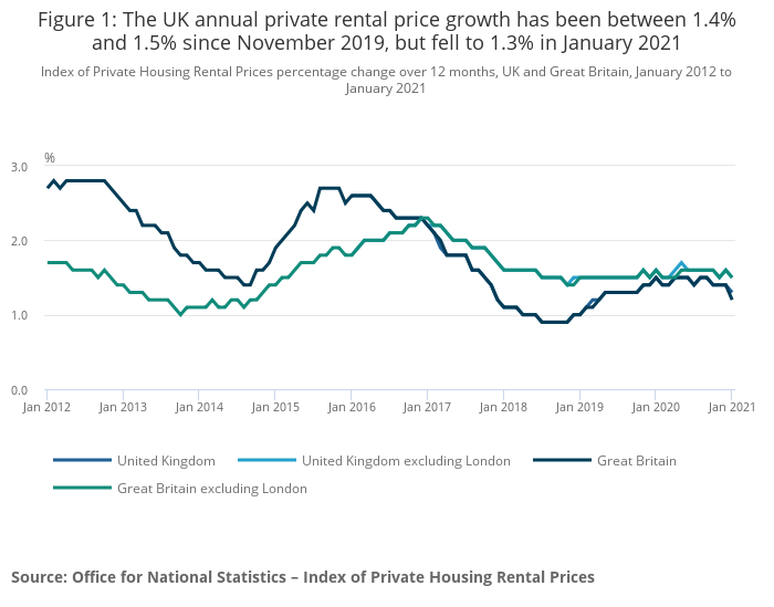 Figure 1: The UK annual private rental price growth has been between 1.4% and 1.5% since November 2019, but fell to 1.3% in January 2021