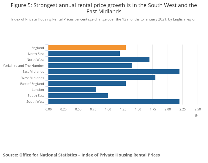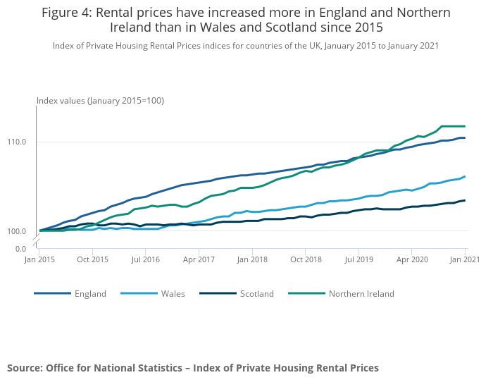 Private rental prices grew by 1.3% in England, 1.6% in Wales and 1.0% in Scotland in the 12 months to January 2021.