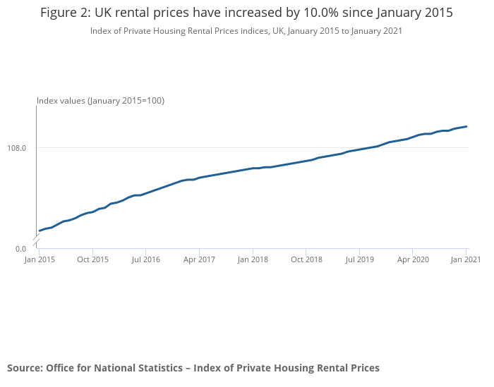 In the 12 months to January 2021, rental prices for the UK excluding London increased by 1.5%, down from 1.6% in the 12 months to December 2020 (Figure 1). London private rental prices increased by 0.8% in the 12 months to January 2021, down from 0.9% in the 12 months to December 2020.