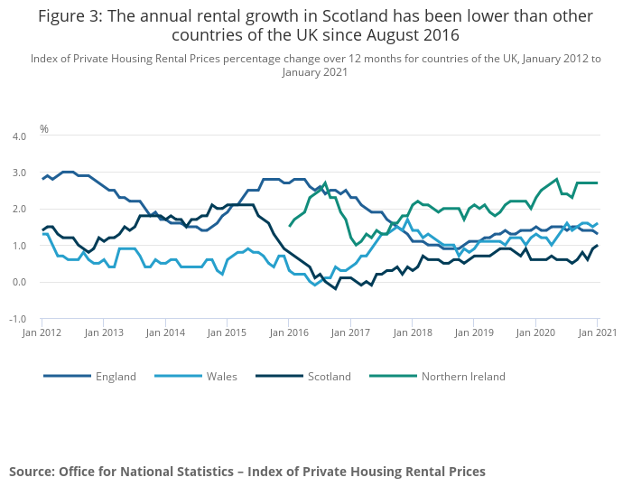 Rental growth in Scotland increased by 1.0% in the 12 months to January 2021, up from 0.9% in the 12 months to December 2020. Scotland's rental growth has remained weaker than the rest of the UK since August 2016.