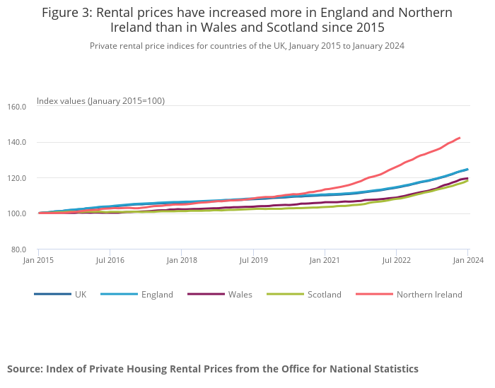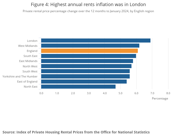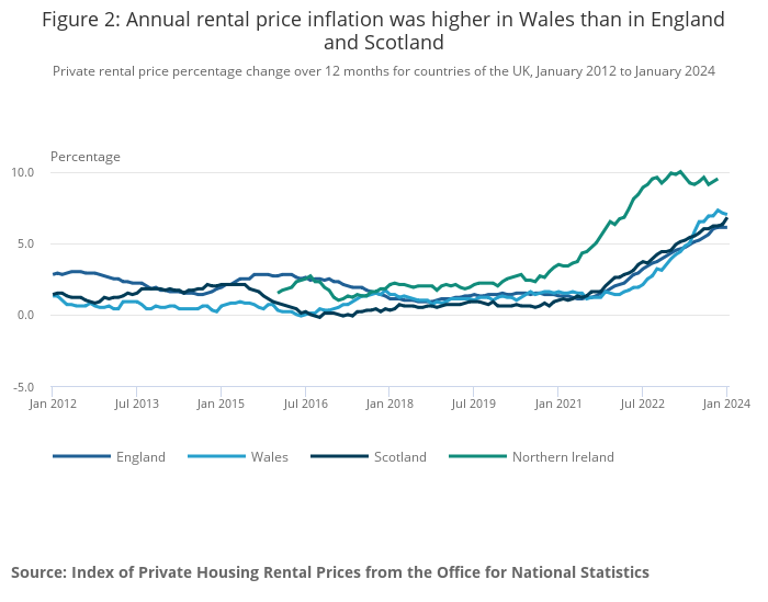Annual private rental prices increased by 6.1% in England, 7.0% in Wales and 6.8% in Scotland in the 12 months to January 2024.
