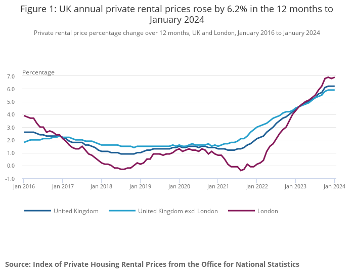 Figure 1: UK annual private rental prices rose by 6.2% in the 12 months to January 2024
