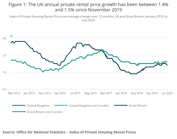 In the 12 months to July 2020, rental prices for the UK excluding London increased by 1.6%, unchanged since April 2020 (Figure 1). London private rental prices increased by 1.1% in the 12 months to July 2020, down from 1.2% in the 12 months to June 2020.