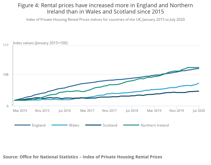 Private rental prices grew by 1.4% in England, 1.6% in Wales and 0.6% in Scotland in the 12 months to July 2020.