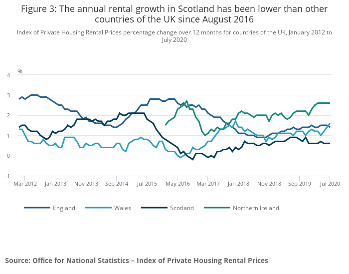 Figure 3: The annual rental growth in Scotland has been lower than other countries of the UK since August 2016