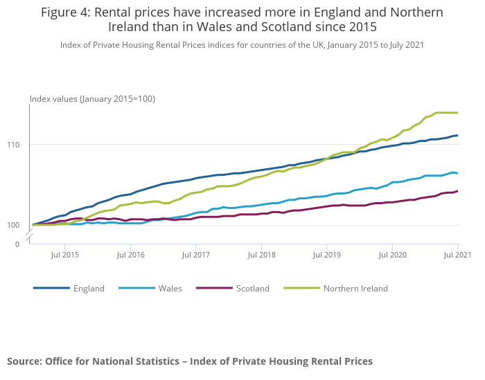 Private rental prices grew by 1.2% in England, 1.1% in Wales and 1.3% in Scotland in the 12 months to July 2021.