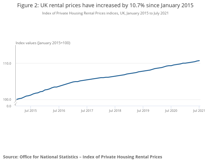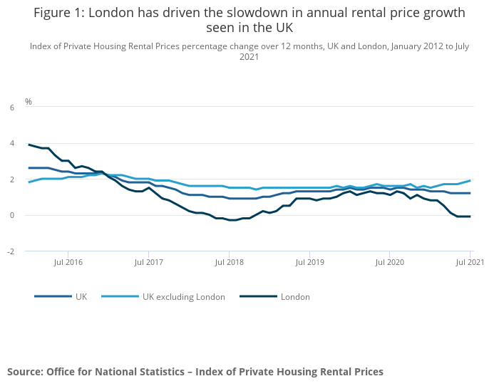 In the 12 months to July 2021, rental prices for the UK excluding London increased by 1.9%, up from an increase of 1.8% in June 2021. London private rental prices decreased by 0.1% in the 12 months to July 2021, unchanged since May 2021.