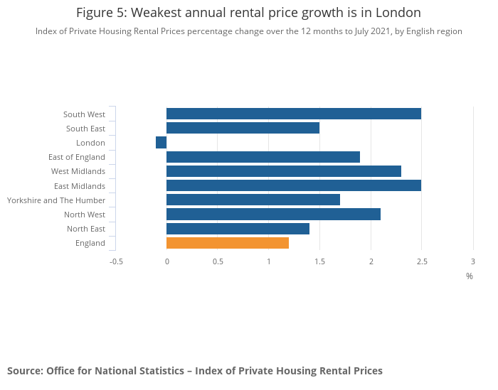 The lowest annual rental price growth was in London where rental prices decreased by 0.1% in the 12 months to July 2021.