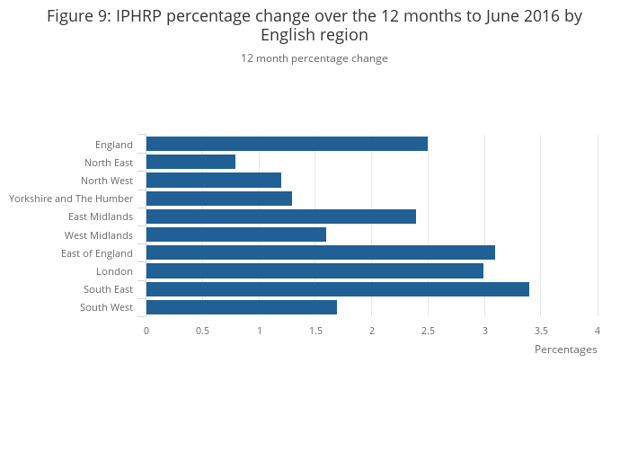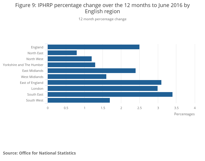 Download this chart Figure 9: IPHRP percentage change over the 12 months to June 2016 by English region