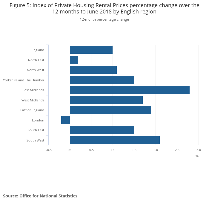 Figure 5: Index of Private Housing Rental Prices percentage change over the 12 months to June 2018 by English region