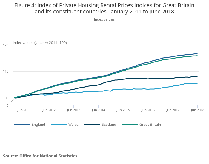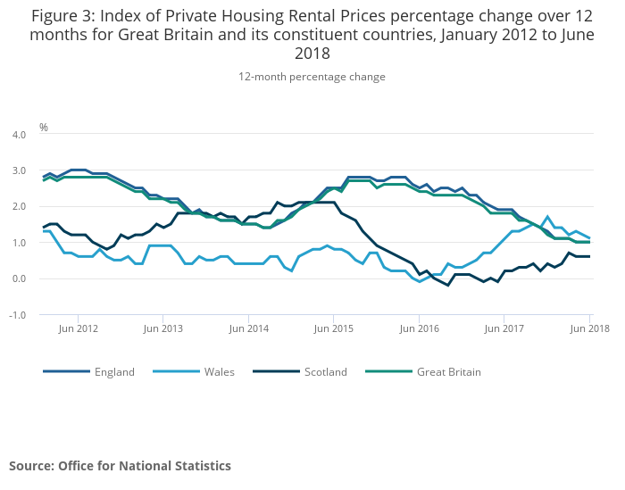 In England, private rental prices grew by 1.0%, Wales saw growth of 1.1% while Scotland saw rental prices increase by 0.6% in the 12 months to June 2018.
