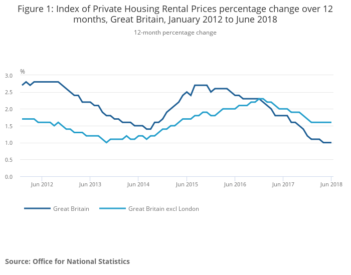 The 12-month growth rate of private rental prices paid by tenants in Great Britain in June 2018 was 1.0%, unchanged since April 2018. Rental prices for Great Britain excluding London increased by 1.6% in the 12 months to June 2018, unchanged since January 2018 (Figure 1). The growth rate for London in the 12 months to June 2018 was negative 0.2%, unchanged from May 2018.