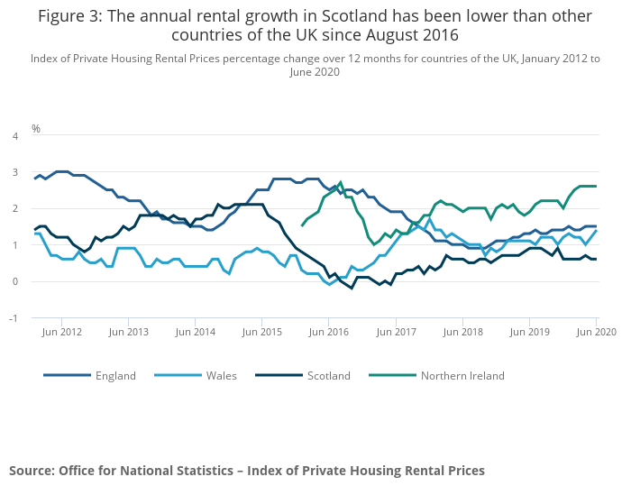 Figure 3: The annual rental growth in Scotland has been lower than other countries of the UK since August 2016