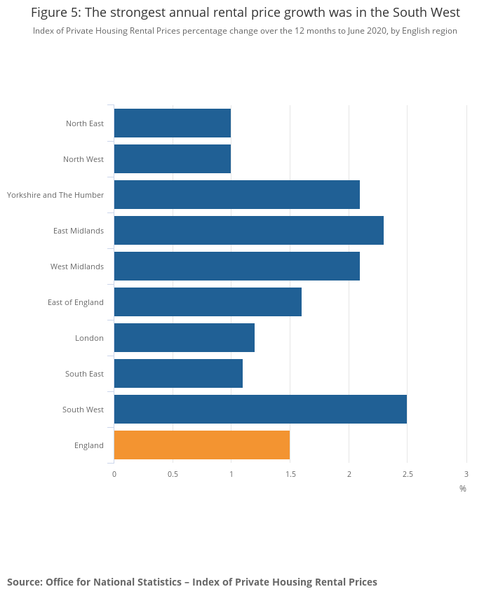 In England, private rental prices grew by 1.5% in the 12 months to June 2020, unchanged since April 2020. When London is excluded from England, privately rented properties increased by 1.7% in the 12 months to June 2020, unchanged since May 2020.