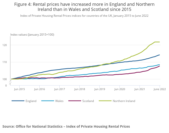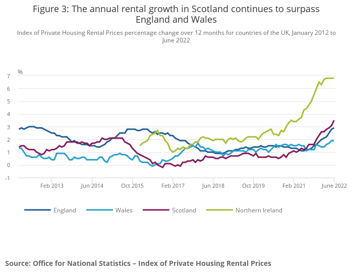 Private rental prices grew by 2.9% in England, 1.9% in Wales and 3.5% in Scotland in the 12 months to June 2022.