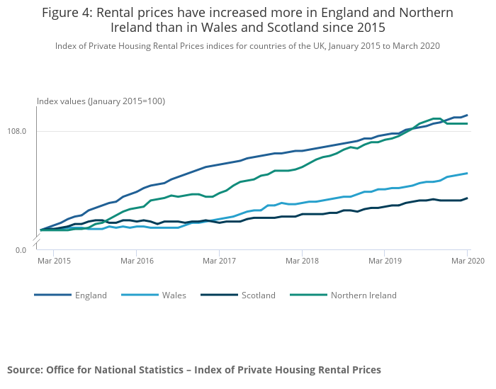 Private rental prices grew by 1.4% in England, 1.2% in Wales and by 0.6% in Scotland in the 12 months to March 2020.