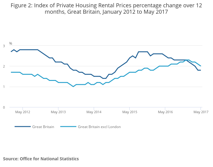Figure 2: Index of Private Housing Rental Prices percentage change over 12 months, Great Britain, January 2012 to May 2017