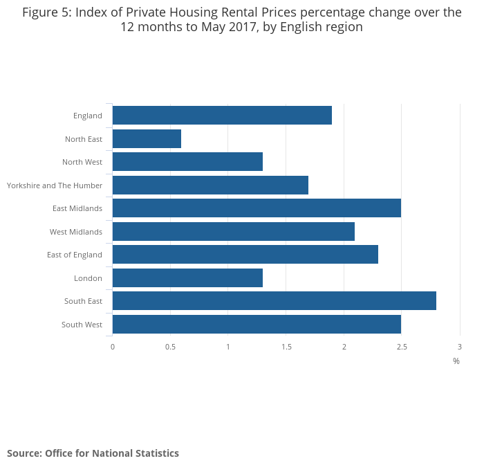Figure 5: Index of Private Housing Rental Prices percentage change over the 12 months to May 2017, by English region