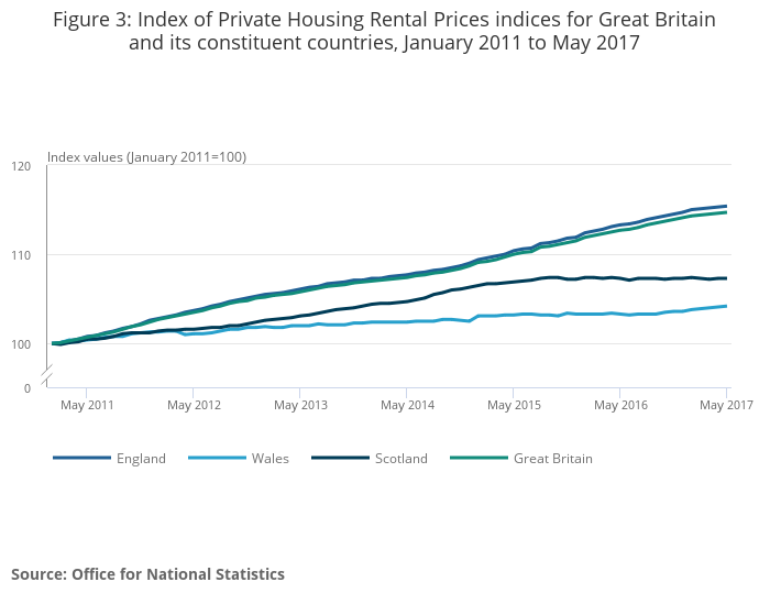 - In England, private rental prices grew by 1.9%, Wales saw growth of 0.9% while Scotland saw rental prices decrease (negative 0.1%) in the 12 months to May 2017.