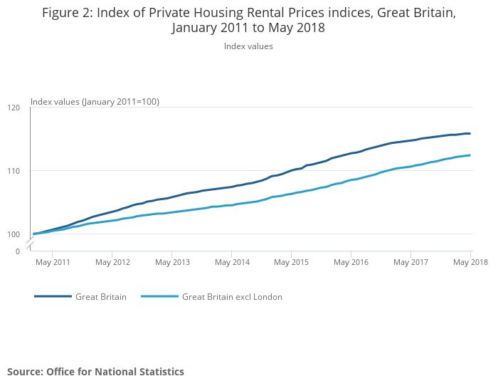 Between January 2011 and May 2018, private rental prices in Great Britain increased by 15.8% (Figure 2); this was strongly driven by growth in private rental prices within London. When London is excluded from these figures, private rental prices increased by 12.4% over the same period.