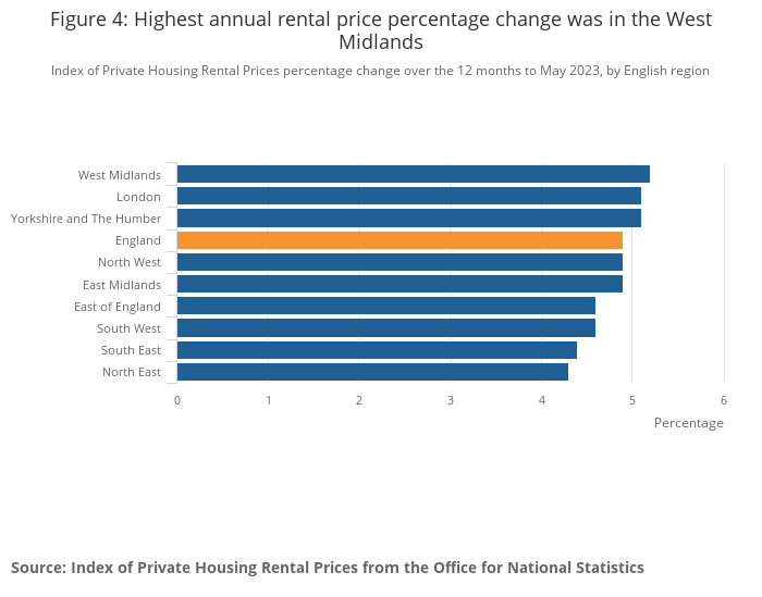 Within England, the highest annual percentage change in private rental prices in the 12 months to May 2023 was in the West Midlands, at 5.2%, while the North East saw the lowest (4.3%).