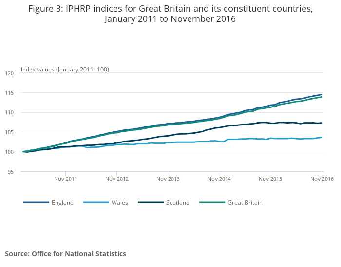 Private rental prices grew by 2.4% in England, 0.1% in Scotland and by 0.3% in Wales in the 12 months to November 2016.