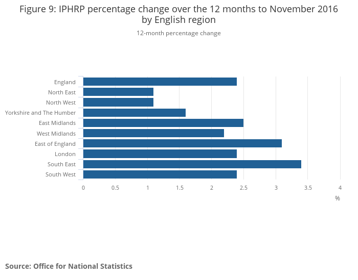 Download this chart Figure 9: IPHRP percentage change over the 12 months to November 2016 by English region