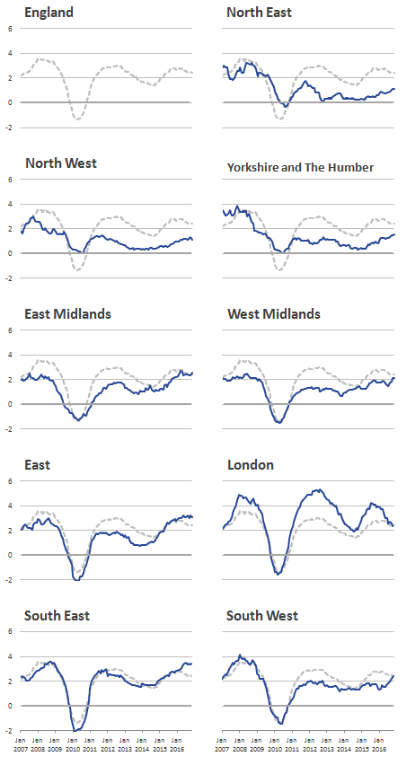 Figure 7: IPHRP percentage change over 12 months by English region, January 2006 to November 2016