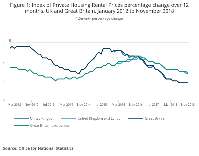Rental prices for the UK excluding London increased by 1.4% in the 12 months to November 2018, unchanged from October 2018 (Figure 1). London private rental prices were unchanged (0.0%) in the 12 months to November 2018; up from a decrease of 0.2% in October 2018.