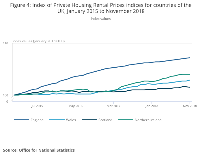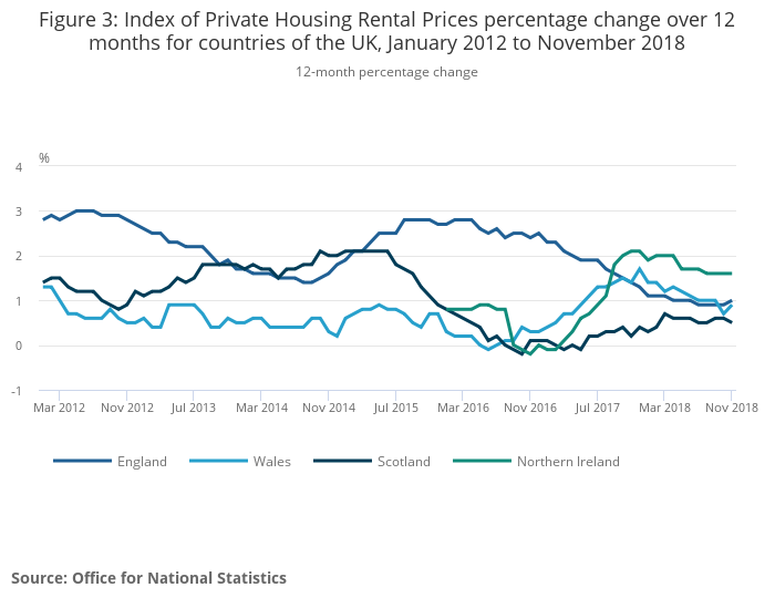 In England, private rental prices grew by 1.0%, Wales experienced growth of 0.9%, while in Scotland private rental prices increased by 0.5% in the 12 months to November 2018.
