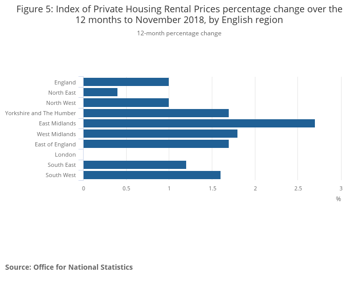 The lowest annual rental price growth was in London where prices were unchanged (0.0%) in the year to November 2018, up from a decrease of 0.2% in October 2018. It was followed by the North East, which increased by 0.4%, up from 0.3% in October 2018.