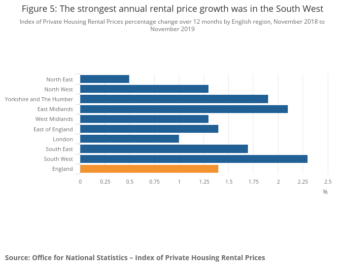 The lowest annual rental price growth was in the North East, where prices increased by 0.5%, followed by London, which increased by 1.0% in the 12 months to November 2019.