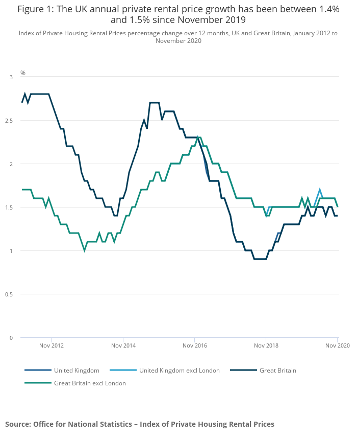 Private rental prices paid by tenants in the UK rose by 1.4% in the 12 months to November 2020, unchanged since October 2020.