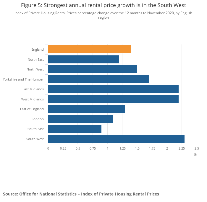The lowest annual rental price growth was in the South East where rental prices increased by 0.9% in the 12 months to November 2020. This was followed by London, at 1.1%.