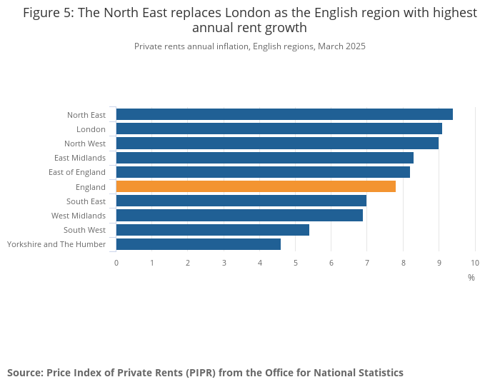 In England, private rents annual inflation was highest in the North East (9.4%) and lowest in Yorkshire and The Humber (4.6%), in the 12 months to March 2025.