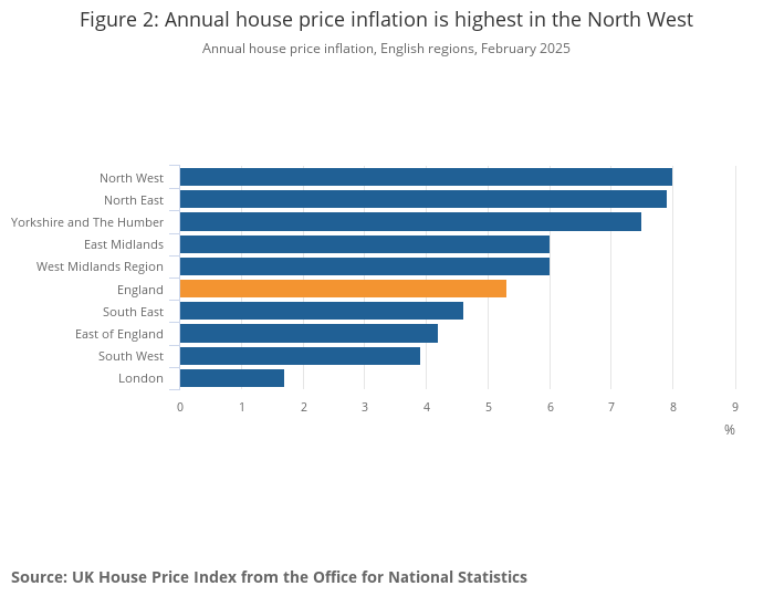 Image .csv .xlsThe North West was the English region with the highest house price inflation in the 12 months to February 2025, at 8.0%. This was up from 6.9% in the 12 months to January 2025.